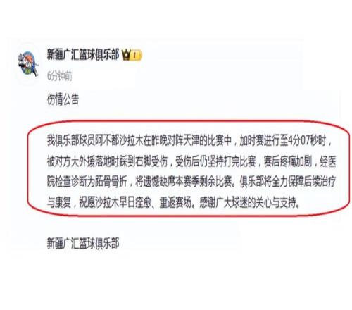 突发!阿不都沙拉木意外重伤,本赛季提前报销