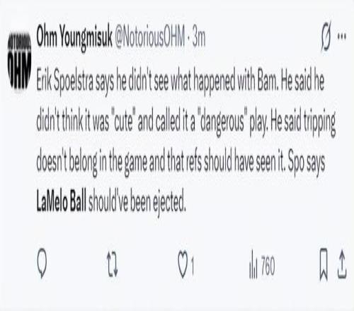 赛后斯波尔特拉谈到鲍尔对阿德巴约的伤人动作:我并没有亲眼目睹三球对阿德巴约的动作,但自己觉得那不是可爱的举动而是一种危险的动作。故意绊人的行为不该出现在比赛中,裁判应该察觉到这一情况。斯波还表示,拉梅洛-鲍尔应该被驱逐出场。