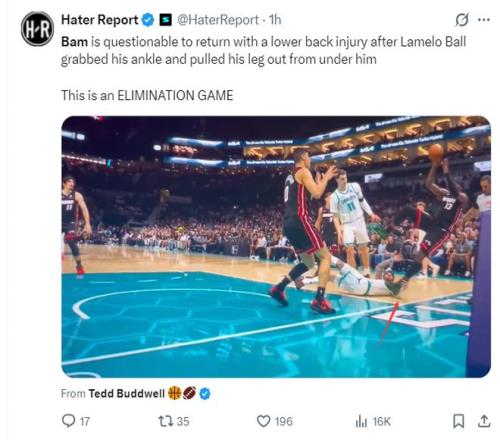 所有人都知道这场比赛黄蜂队有主场哨,拉梅洛-鲍尔故意拉拽阿德巴约的脚后跟导致热巴背部着地伤退。要知道阿德巴约是热火的攻防核心,常规赛场均20.1分10篮板3.2助攻1.2抢断0.7盖帽的球星,下场前他3中3碾碎黄蜂内线,他的伤退直接导致热火的攻防等级下滑。