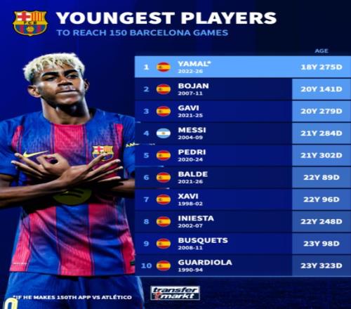 如果亚马尔本周三按预期出场对阵马竞,他当时的年龄是18岁零275天,将成为巴萨队史远比其他人都年轻的150场球员。