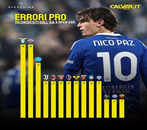 本赛季意甲球队遭遇VAR误判次数: