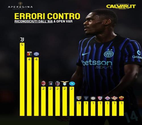 北京时间4月15日,意大利媒体Calvar.it统计出了本赛季至今意甲球队遭遇VAR误判的次数,尤文图斯5次位居第一,遭遇4次VAR误判的国际米兰目前仍以9分优势领跑积分榜。